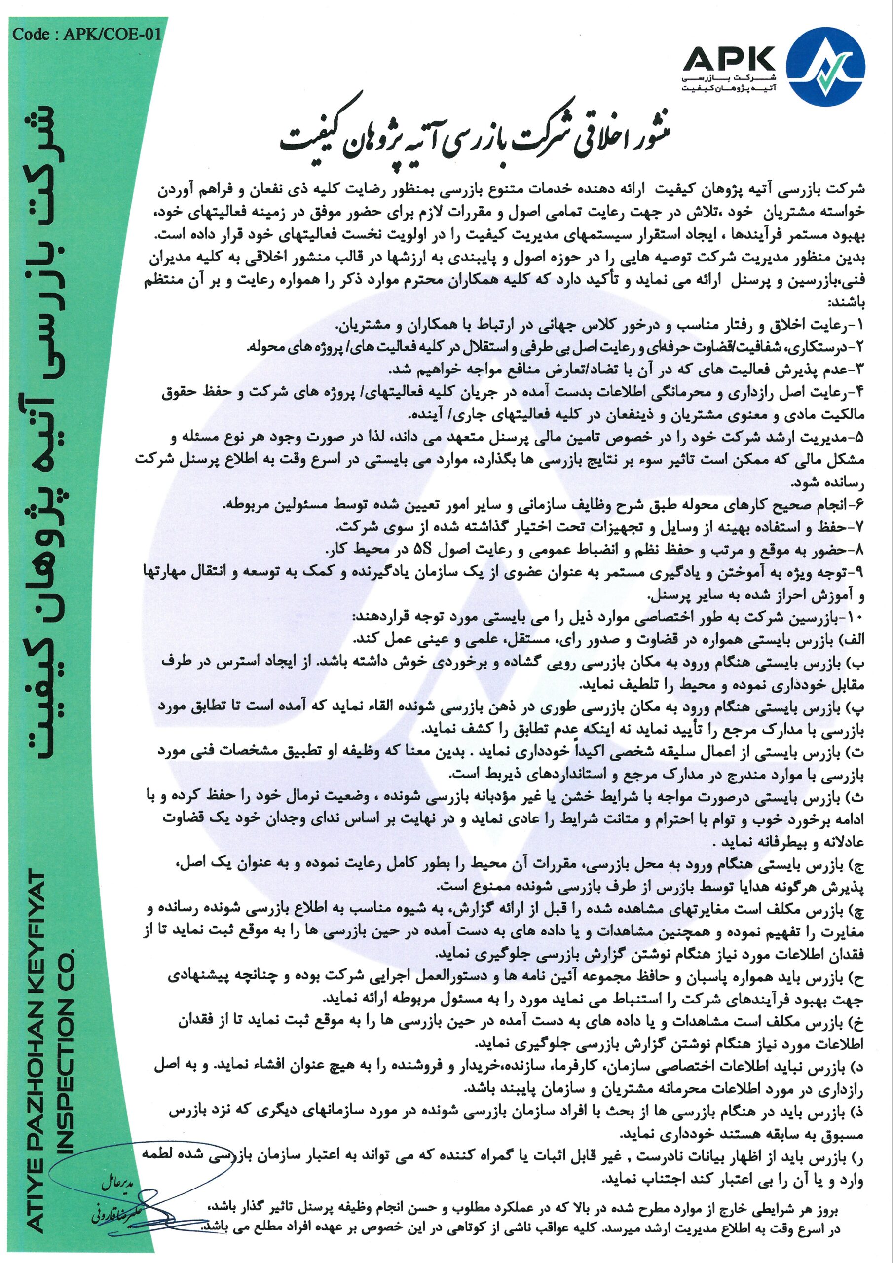 در این بخش، اسناد مهم سازمان شامل چارت سازمانی، منشور اخلاقی، بیانیه حفاظت از اطلاعات و خط مشی کلی شرکت ارائه شده است